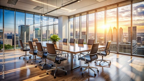 Modern office conference room with sleek table and chairs, blurred background, and floor-to-ceiling windows, evoking a sense of innovation and corporate sophistication.