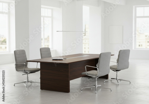 Modern office desk with wooden top and grey chairs, laptop open, notepad and pen on the side, large windows with city view, minimalist decor.