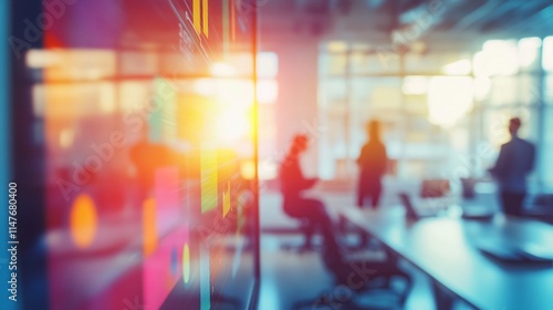Modern Office Environment with Data Visualization Displaying Colorful Graphs and Silhouetted Professionals Collaborative Working Atmosphere