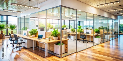 Modern Office Interior Design, Tilt-Shift Photography Mockup, Bright Spacious Glass Partitions, Minimalist Workspace