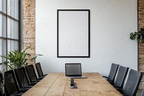 Modern office interior featuring a large blank frame on a textured wall. with a wooden table. laptop. and plants. creating a professional and inviting atmosphere