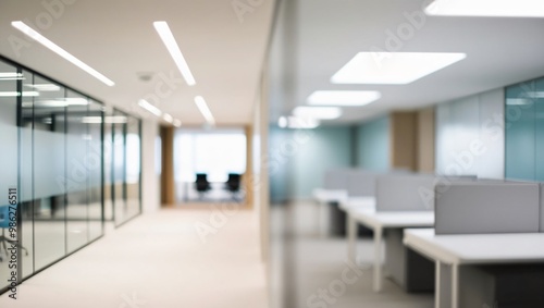 Modern office interior showcasing a minimalist design with glass walls, conference rooms, cubicles, and a neutral color scheme for a professional look, generative ai