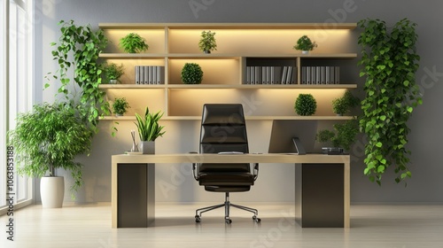 Modern office interior with a large desk, black leather chair, and a bookshelf with plants.