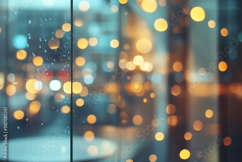 Modern office interior with blurred bokeh lights and glass door for business presentation design