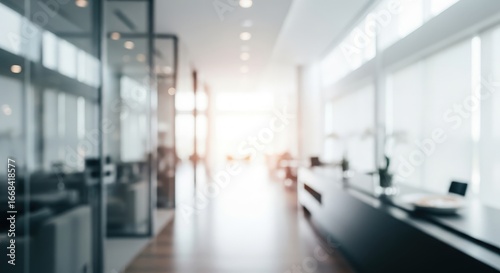 Modern office interior with bright natural light, sleek furniture, and a serene atmosphere