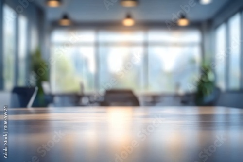 Modern Office Interior with Large Windows and Bright Lighting in Blurred Background