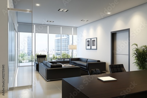Modern office interior with large windows, black leather furniture, and a wooden desk.