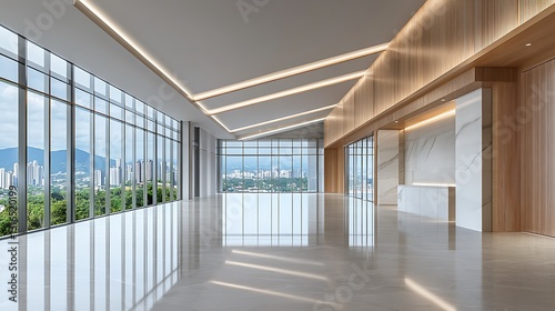 Modern Office Lobby 3D Render: Panoramic City View AI Generated