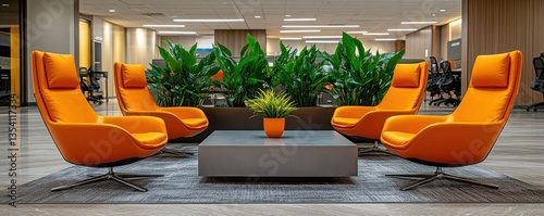Modern Office Lounge Interior with Orange Chairs and Green Plants