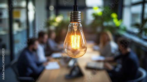 Modern office meeting illuminated by a light bulb, representing a fresh concept for business
