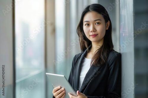 modern office portrait confident young asian businesswoman in sleek attire holding tablet standing against minimalist backdrop with subtle city view