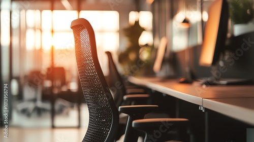 Modern office setting featuring ergonomic chairs and computers bathed in warm sunset light, creating a productive atmosphere.