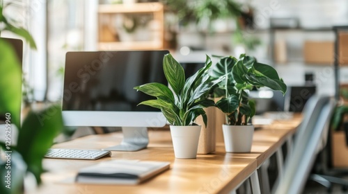 Modern Office Setup with Plants and Bright Lighting