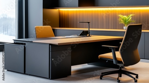Modern office space featuring a sleek desk, ergonomic chair, and minimalistic decor.