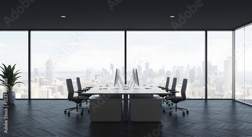 Modern Office Space with City View and Dark Wood Herringbone Flooring