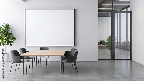 Modern office with a large wall frame mockup, a white blank on a square wooden table in a conference room, grey chairs and a concrete floor. A glass door to another space, soft lighting, a