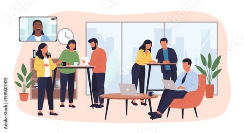 Modern Office Workers Collaborating: Diverse Team in a Bright Workspace, Perfect for Business Presentations.