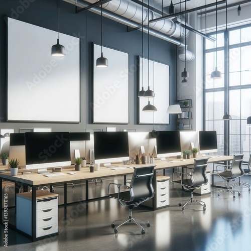 Modern office workspace featuring sleek desks, stylish chairs, and large windows. Ideal for promoting productivity and creativity in a contemporary business environment.