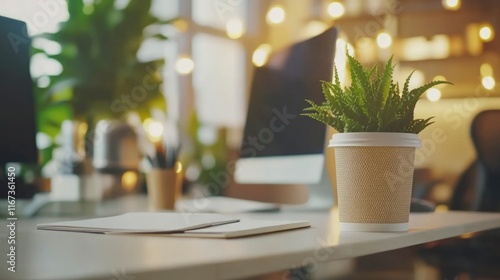 Modern Office Workspace Plant Notebook And Computer