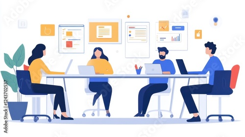 Modern Office Workspace with Diverse Team Collaborating on Laptops in Bright, Minimalist Setting with Charts and Plants