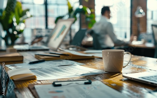Modern office workspace with documents, coffee mug, and blurred worker in background. Bright natural light through large windows.