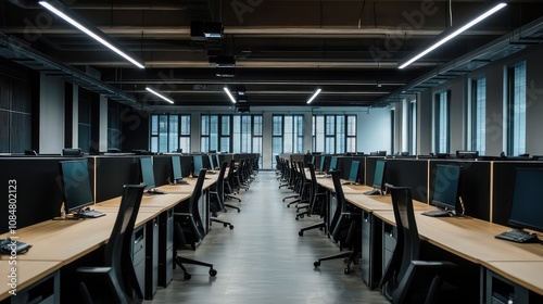 Modern Office Workspace with Rows of Desks and Computers in Bright, Minimalist Environment, Perfect for Creative and Corporate Use