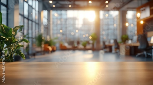 Modern Office Workspace with Sunlight Streaming Through Large Windows, Creating a Warm and Inviting Atmosphere