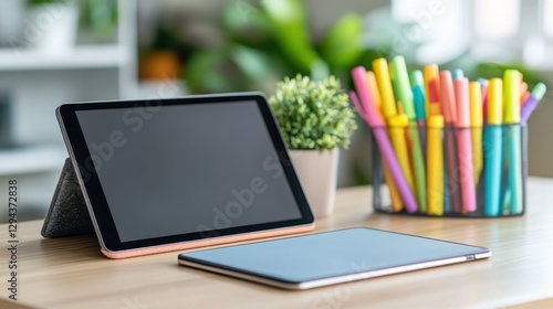 Modern Office Workspace with Tablets, Stationery, and Green Plant