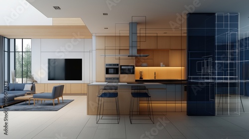 Modern open-concept living room and kitchen design with wooden cabinets, large flat-screen TV, blue sofas, and natural lighting from large windows.
