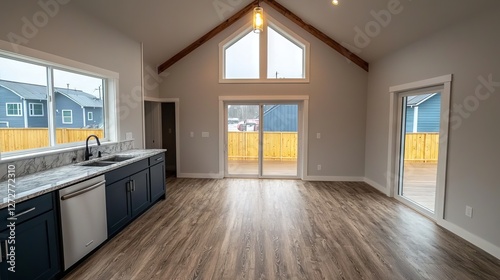 Modern open-concept living space with large windows and wooden accents