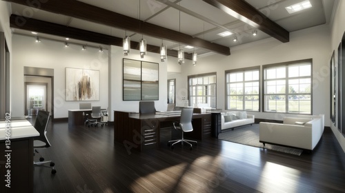 Modern open-plan office interior, natural light, comfortable furniture, business hub