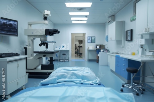 Modern Ophthalmology Examination Room with Equipment, Microscope, and Patient Bed Ready for Surgery.