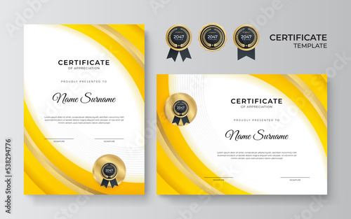 Modern orange and yellow certificate template design for business and achievement award with gold badge