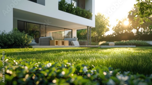 Modern Outdoor Living Space Surrounded by Lush Greenery During Sunset Hours