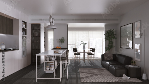 Modern panoramic living room, kitchen and dining room in dark and wooden tones. Island with stools, table, chairs, sofa. Potted plants and accessories. Interior design concept