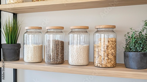 Modern pantry with glass jars filled with grains on wooden shelf