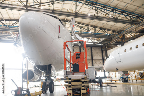 Modern passenger airplane on maintenance repair check in airport hangar indoors. Aircraft. Plane, shipping, transportation concept