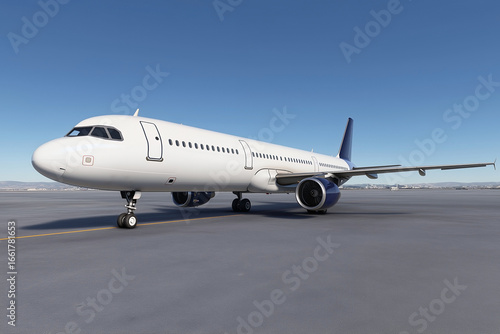 Modern Passenger Airplane Parked On Runway Under Clear Blue Sky In Bright Sunny Daytime Scene
