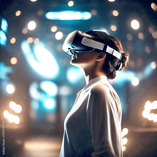 Modern people using virtual reality headsets in stylish interior or abstract space, with room for text