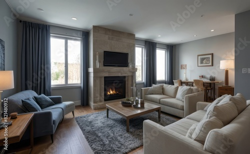 Modern professional photograph of a navy blue and silver luxury living room interior with floor-to-ceiling windows and a cozy fireplace