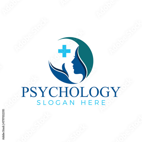 Modern psychology logo design featuring a womans profile in a circle with a cross and leaves, representing mental health and wellbeing
