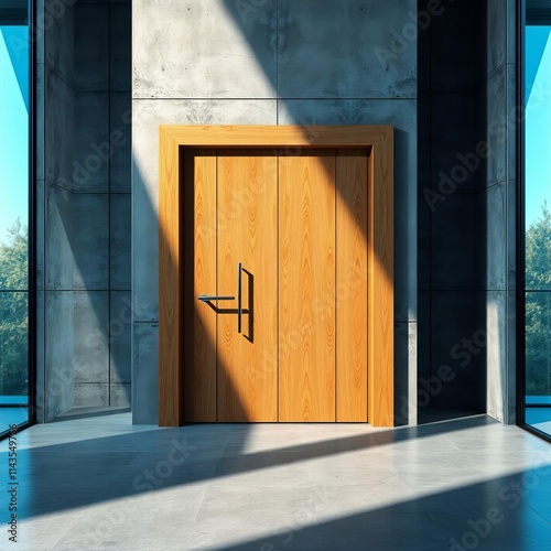 Modern quality wooden door in contemporary interior solid oak door with stainless steel handle set in concrete wall wood concrete design wood design concrete architecture wall floor modern