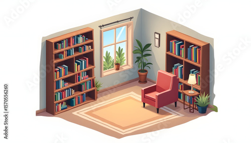 Modern reading nook with bookshelves and a cozy chair. Represents learning, relaxation, home library, or intellectual pursuits. Inviting and warm.