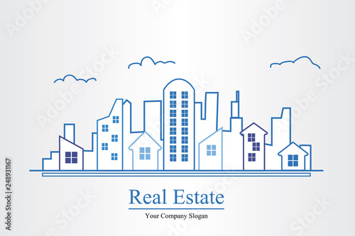 Modern real estate of architectural building design, city scene, logo design template, corporate branding identity.