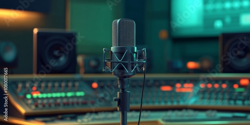 Modern recording studio setup with microphone on stand, mixing console, speakers, and audio equipment in blue and green tones.