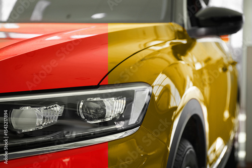 Modern red auto before and golden after painting, closeup. Comparative collage of car repaint