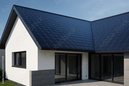 Modern Residence Architecture: A pristine, contemporary dwelling, showcasing innovative architectural design with clean lines, solar panels.