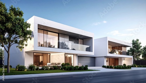 Modern Residential Architecture Featuring White Structures and Green Trees under Blue Sky