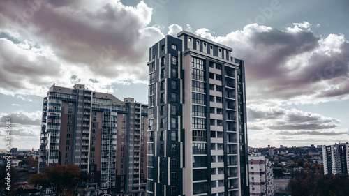 Modern residential buildings district cityscape in autumn with epic evening cloudy sky. Downtown Kharkiv city, Ukraine
