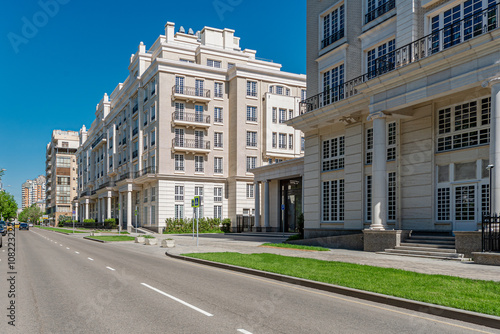 Modern residential buildings with classic architectural elements along a clean, quiet urban street on a sunny day